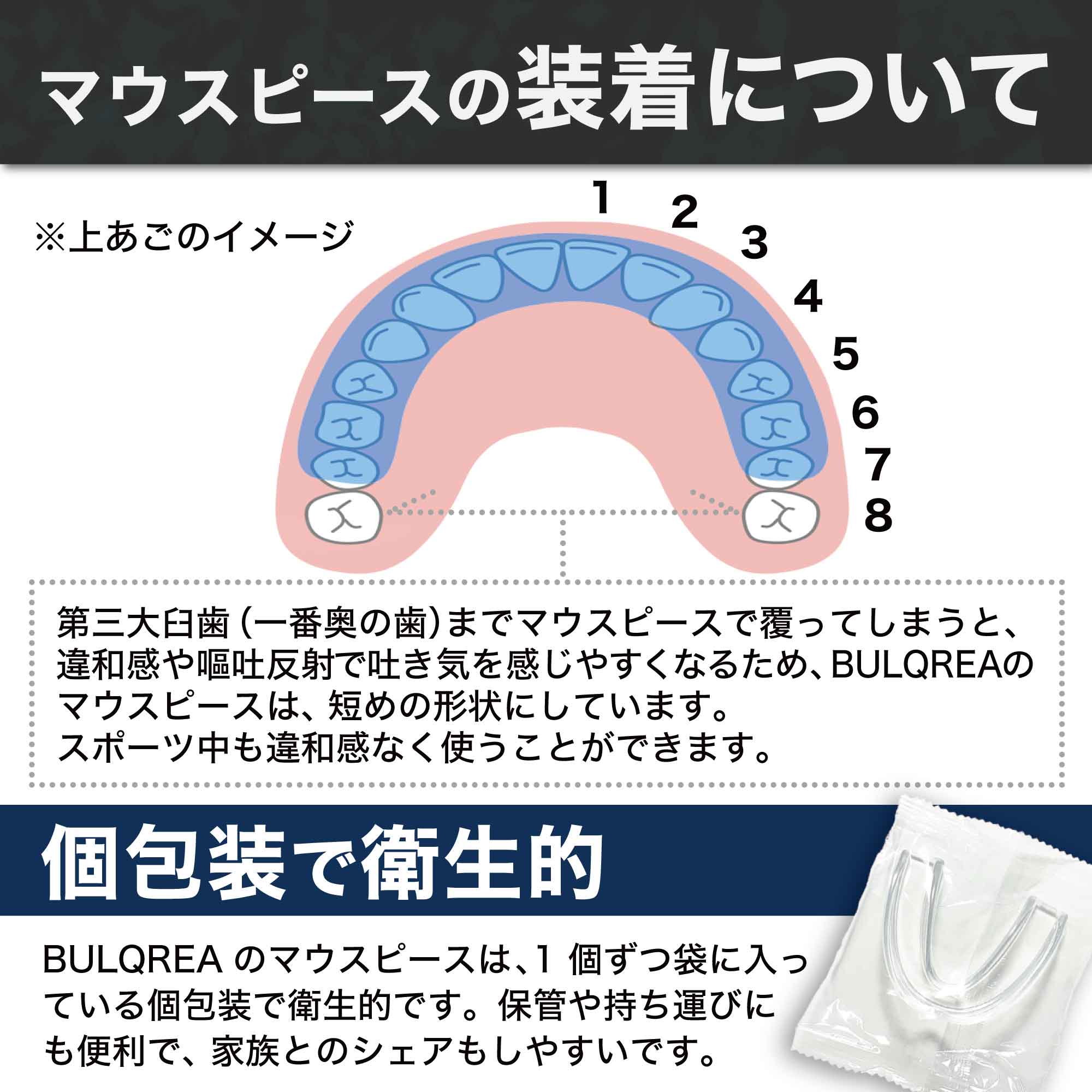 使用方法:型取りをした後、一番奥歯以外のマウスピースを覆うように装着