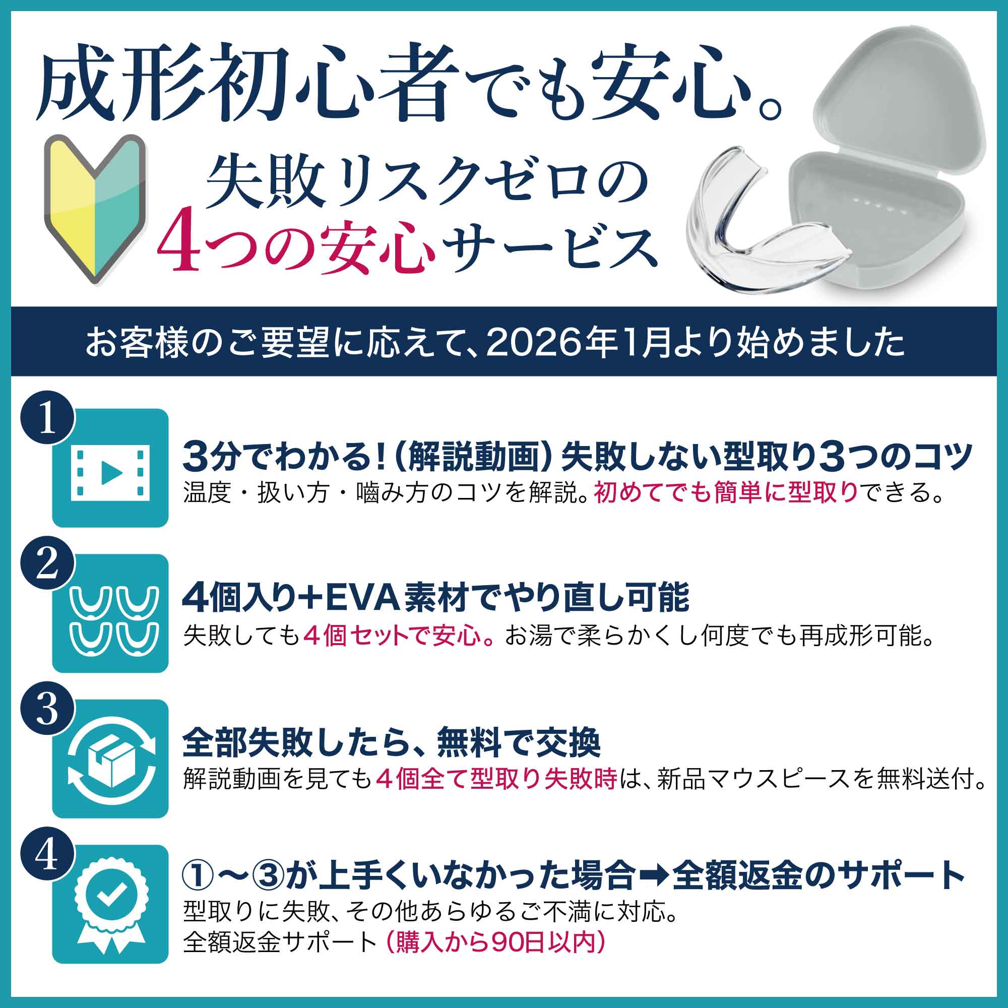 MY HOME DENTALは、万が一失敗しても、再度お湯につけることで、何度でも作り直しができます。また、4個セットの商品なので、型取りや微調整の際のカットに失敗しても安心です。