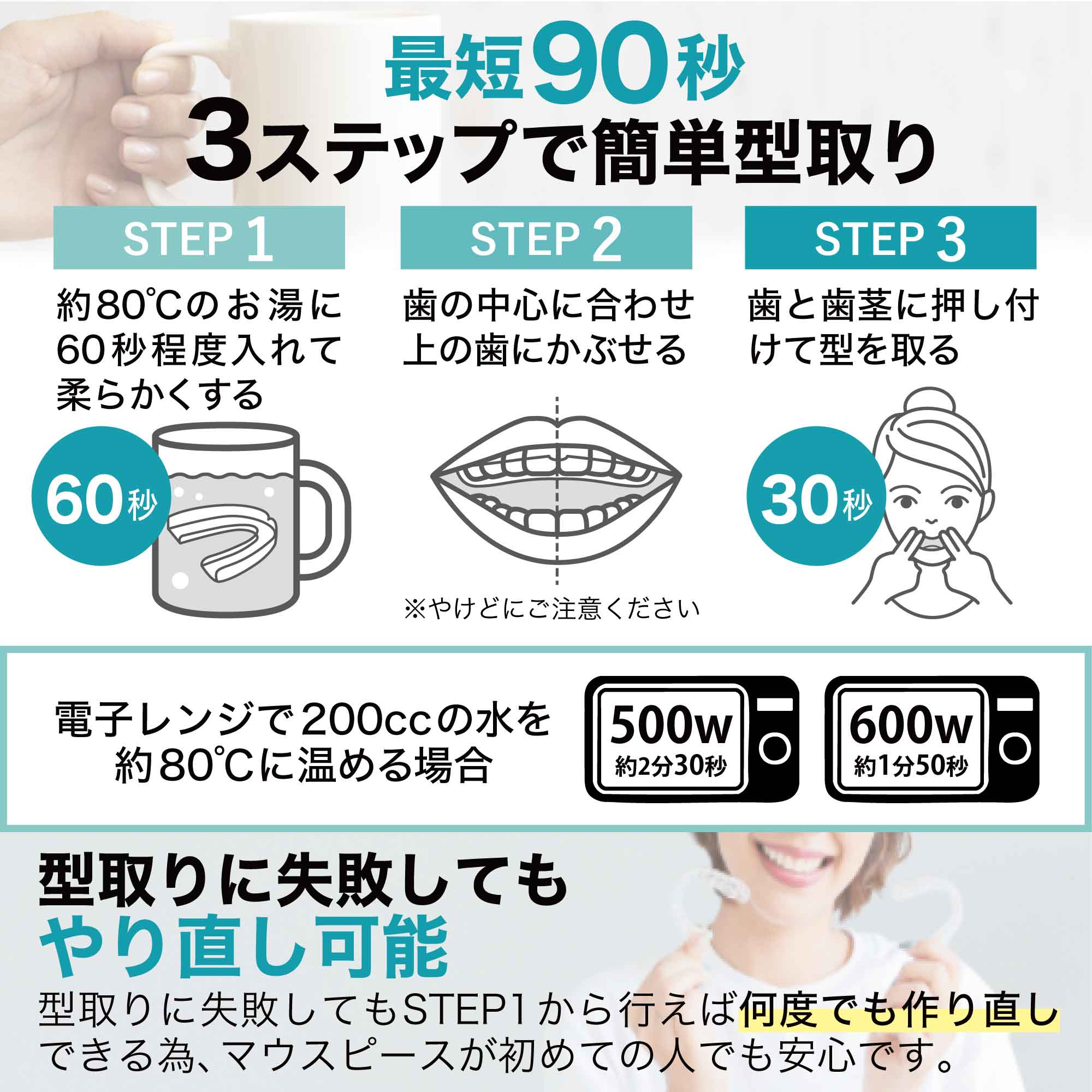 市販のマウスピースは商品によって作り方が違いますので、詳しい作り方は付属の説明書をご覧ください。