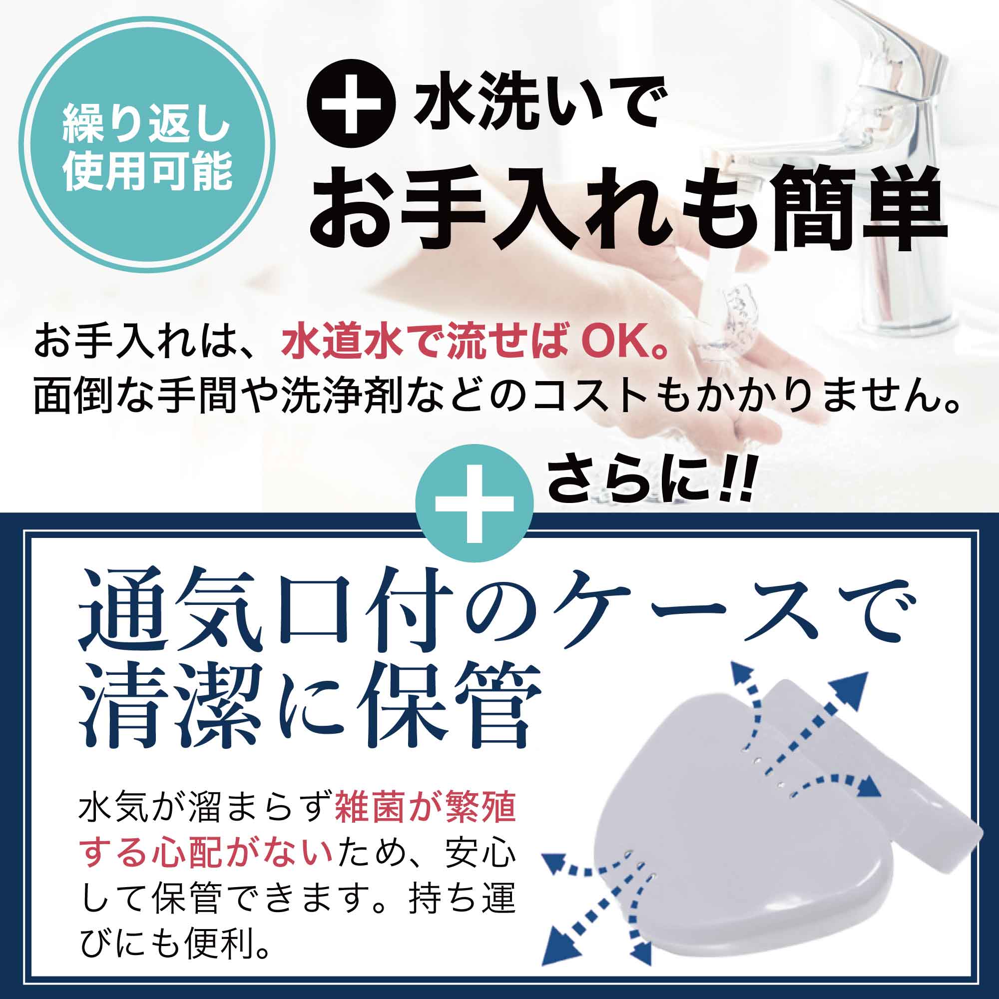 MY HOME DENTALは、専用のケースが付属しているので保管場所にも困りません。専用ケースは通気口付きで水気が溜まらないため、雑菌の繁殖を防ぎます。また、軽量なので持ち歩きにも便利です。紛失や破損を防ぐためにも、使用後は専用ケースに入れて保管しましょう。