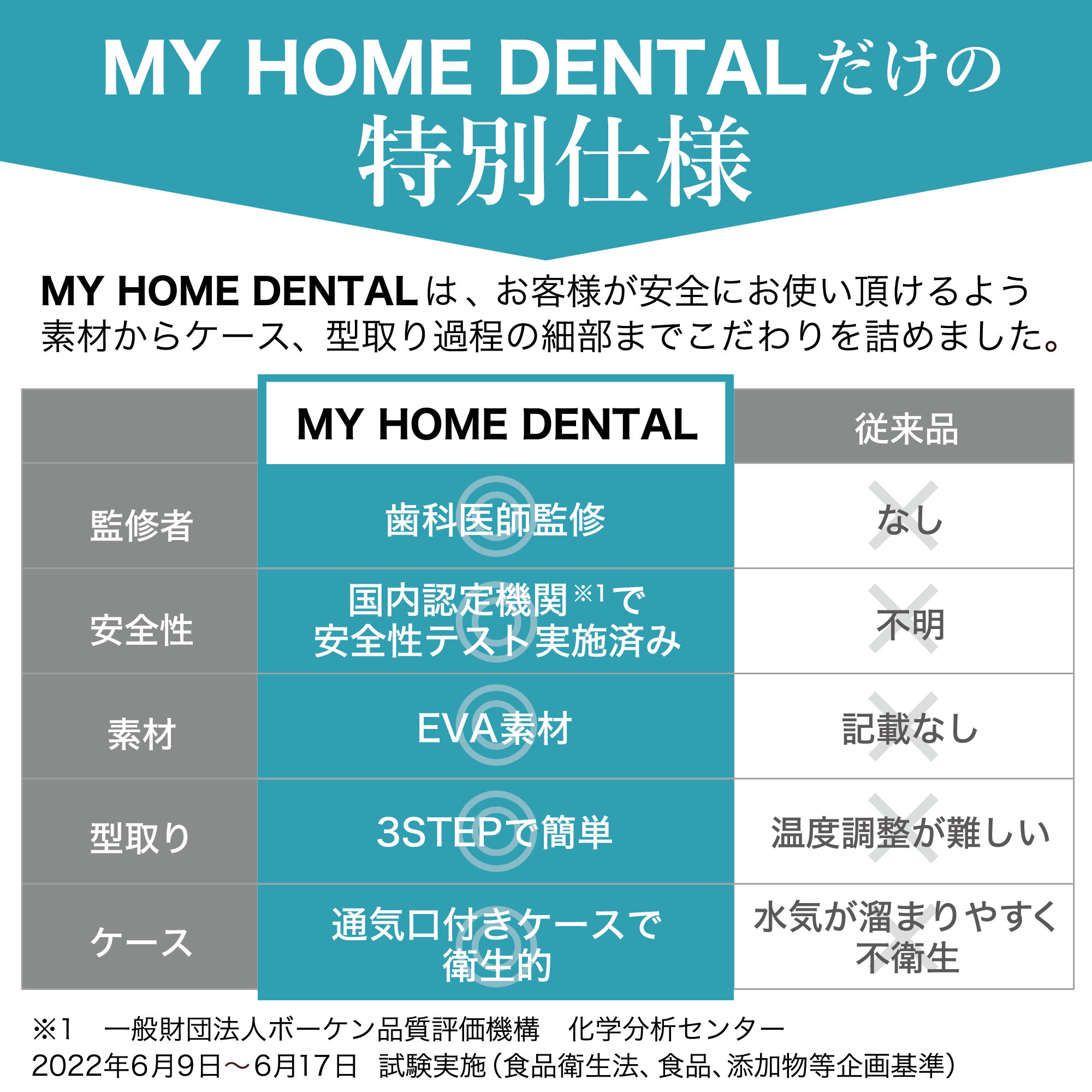 MY HOME DENTALは、睡眠中の歯や健康を守るために、歯科医師監修の元、1年8ヶ月で63個の既存商品を分析して開発した、自分専用マウスピースです。