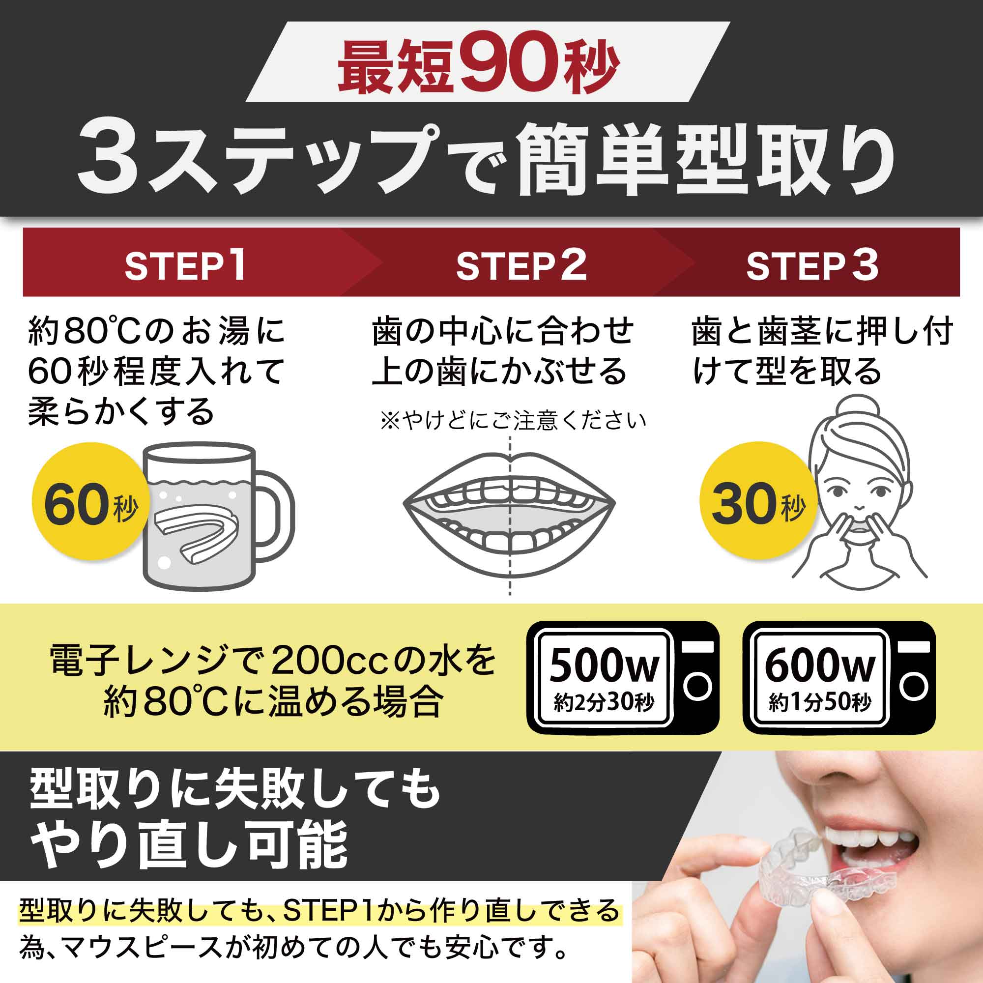 使用方法:型取りをした後、一番奥歯以外のマウスピースを覆うように装着